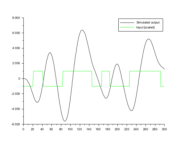 a = [1, -2.851, 2.717, -0.865]; b = [0, 1, 1, 1]; d = [1, 0.7, 0.2]; ar = armac(a, b, d, 1, 1, 1); disp(_("Simulation of an ARMAX process:")); disp(ar); // The input n = 300; u = -prbs_a(n, 1, int([2.5,5,10,17.5,20,22,27,35]*100/12)); // simulation zd = narsimul(ar, u); // visualization plot2d(1:n,[zd',1000*u'],style=[1,3]);curves = gce(); legend(["Simulated output";"Input [scaled]"])