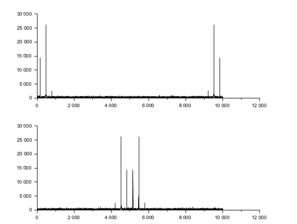 // Make a signal t = 0:0.1:1000; x = 3*sin(t)+8*sin(3*t)+0.5*sin(5*t)+3*rand(t); // Compute the fft y = fft(x,-1); // Display clf(); subplot(2,1,1); plot2d(abs(y)) subplot(2,1,2); plot2d(fftshift(abs(y)))