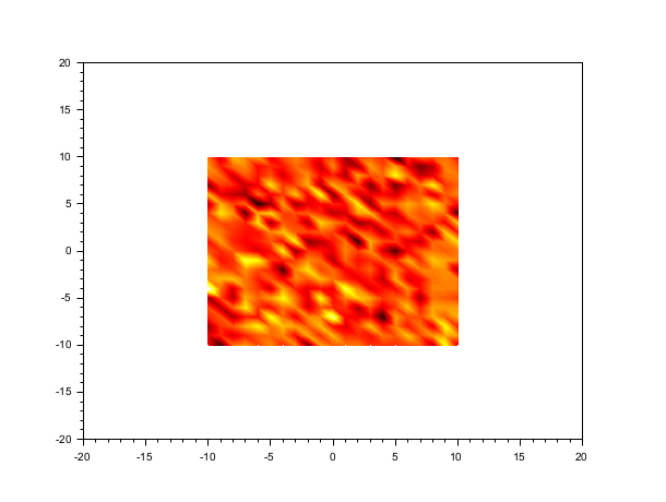 // 例 #1 x=-10:10; y=-10:10;m =rand(21,21); clf() gcf().color_map = hot(64); Sgrayplot(x,y,m, strf="011", rect=[-20,-20,20,20])