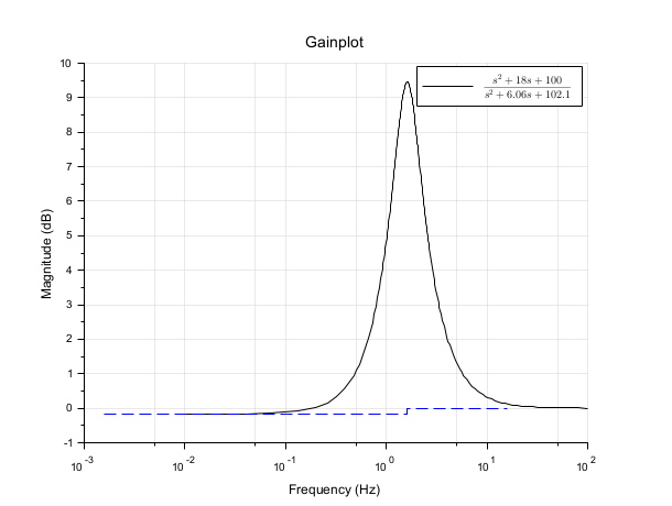 s = poly(0, "s"); h = syslin("c", (s^2+2*0.9*10*s+100)/(s^2+2*0.3*10.1*s+102.01)); h = tf2ss(h); clf(); gainplot(h, 0.01, 100, "$\frac{s^2+18 s+100}{s^2+6.06 s+102.1}$"); // Frequencies in Hertz bode_asymp(h)
