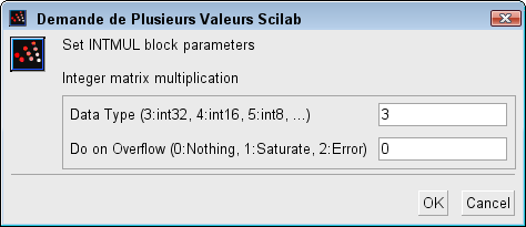 Entrées : matrices, vecteurs ou scalaires. Type entiers de Scilab (paramètre Data Type).