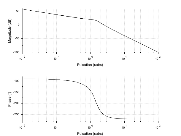 s = %s; G = (10*(s+3))/(s*(s+2)*(s^2+s+2)); // A rational matrix sys = syslin('c', G); // A continuous-time linear system in transfer matrix representation. f_min = .0001; f_max = 15; // Frequencies in Hz clf(); bode(sys, f_min, f_max, "rad"); // Converts Hz to rad/s