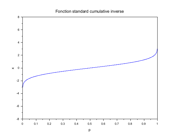 // Afficher la fonction fonction standard cumulative inverse Mean = 0; Std = 1; p = linspace(1e-10,1-1e-10,1000); q = 1-p; x = cdfnor("X",Mean*ones(p),Std*ones(p),p,q); plot(p,x) xtitle("Fonction standard cumulative inverse","p","x");