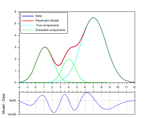 // Basic gaussian component: function Y=gauss(X, average, stDev, ymax) Y = ymax * exp(-(X-average).^2 / (2*stDev*stDev)) endfunction // Model: cumulated gaussian laws function r=model(P, X) // P(1,:): averages P(2,:): standard deviation P(3,:): ymax r = 0; for i = 1:size(P,2) r = r + gauss(X, P(1,i), P(2,i), P(3,i)); end endfunction // Gap function: function r=gap(P, XY) r = XY(2,:) - model(P, XY(1,:)) endfunction // True parameters : Pa = [ 1.1 4 7 // averages 1 0.8 1.5 // standard deviations 3 2 5.5 // ymax ]; Nc = size(Pa,2); // Number of summed curves Np = 200; // Number of data points // Data generation (without noise) xmin = 0; xmax = 10; X = linspace(xmin-2, xmax+2, Np); Y = model(Pa, X); Data = [X ; Y]; // Curve to analyze / fit // FITTING // ------- // Fitting parameters: initial values and bounds (amplitudes must be > 0) Po = [ linspace(xmin,xmax,Nc) ; ones(1,Nc)*0.5 ; ones(1,Nc)*max(Y)/2]; Pinf = [ones(1,Nc)*-2 ; ones(1,Nc)*0.1 ; ones(1,Nc)*1]; Psup = [ones(1,Nc)*12 ; ones(1,Nc)*3 ; ones(1,Nc)*max(Y)*1.2]; // Fitting [P, dmin] = datafit(gap, Data, 'b',Pinf,Psup, Po, 'qn','ar',200,200); // Display // ------- clf() xsetech([0 0 1 0.8]); plot(X, Y, "-b", X, model(P,X), "-r"); gca().children.children(1:2).thickness = 2; for i = 1:Nc plot(X, gauss(X, Pa(1,i), Pa(2,i), Pa(3,i)), "-c"); // True gaussian components plot(X, gauss(X, P(1,i), P(2,i), P(3,i)), "-g"); // Extracted gaussian components end legend("Data", "Parametric Model","True components", "Extracted components", 2); xsetech([0 0.75 1 0.25]) plot(X, model(P,X)-Y); gca().x_location = "top"; gca().x_ticks.labels = emptystr(size(gca().x_ticks.labels,"*"),1); ylabel("Model - Data") xgrid(color("grey70"))