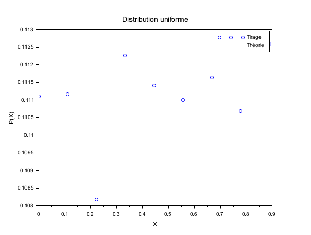 m = 50000 ; n = 10; X = grand(m,1,"def"); bins = linspace(0,1,n)'; [i_bin, counts] = dsearch(X, bins); e = 1/(n-1)*ones(1,n-1); scf() ; plot(bins(1:n-1), counts/m,"bo"); plot(bins(1:n-1), e',"r-"); legend(["Experiment","Expectation"]); xtitle("Uniform random numbers","X","P(X)");