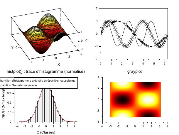 // 4 dessins sur une seule fenêtre clf() set(gca(),"font_style",2,"font_size",0); xsetech([0,0,0.5,0.5]); plot3d() xsetech([0.5,0,0.5,0.5]); plot2d() xsetech([0.5,0.5,0.5,0.5]); grayplot() xsetech([0,0.5,0.5,0.5]); histplot() // retour aux valeurs par défaut xsetech([0,0,1,1])