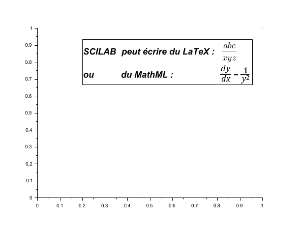 plot2d([0, 1], [0, 1], 0); mathml = "<mrow>" +.. "<mfrac>" +.. "<mrow>" +.. "<mi> d </mi>" +.. "<mi> y </mi>" +.. "</mrow>" +.. "<mrow>" +.. "<mi>d</mi>" +.. "<mi>x</mi>" +.. "</mrow>" +.. "</mfrac>" +.. "<mo> = </mo>" +.. "<mfrac>" +.. "<mn> 1 </mn>" +.. "<msup>" +.. "<mi> y </mi>" +.. "<mn> 2 </mn>" +.. "</msup>" +.. "</mfrac>" +.. "</mrow>"; str=["SCILAB", "peut écrire du LaTeX :", "$\frac{abc}{xyz}$"; "ou", "du MathML :", mathml]; r2 = xstringl(0.2, 0.4, str, 10, 4); xrects([r2(1) r2(2)+r2(4) r2(3) r2(4)]'); txt = xstring(r2(1), r2(2), str); txt.font_size = 4; txt.font_style = 10;