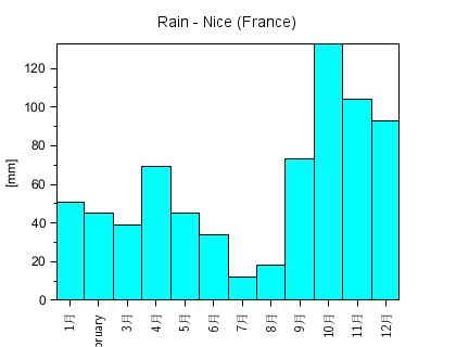 rain_Nice = [51 45 39 69 45 34 12 18 73 133 104 93 ]; months = _(["January" "February" "March" "April" "May" "June" "July" .. "August" "September" "October" "November" "December"]); clf bar(rain_Nice,1,"cyan"); title(_("Rain - Nice (France)"), "fontsize",3) ylabel("[mm]") gca().x_ticks.labels = "$\rotatebox{90}{\mathsf{"+months'+"}}$"; set(gca(), "tight_limits", "on", "font_size", 2);