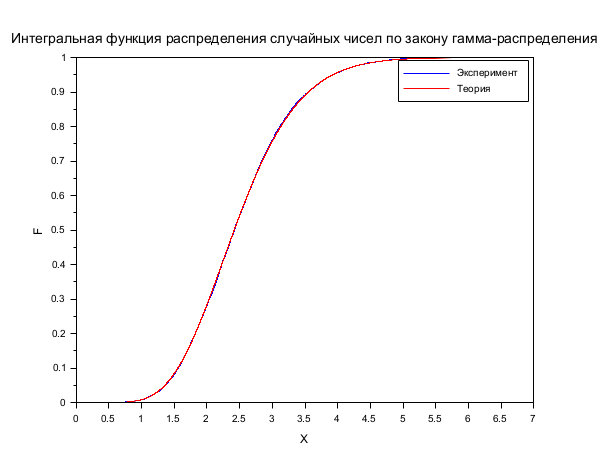 N=10000; A=10; B=4; R=grand(1,N,"gam",A,B); XS=gsort(R,"g","i")'; PS=(1:N)'/N; P=cdfgam("PQ",XS,A*ones(XS),B*ones(XS)); scf(); plot(XS,PS,"b-"); // Эмпирическое распределение plot(XS,P,"r-"); // Теоретическое распределение legend(["Эксперимент" "Теория"]); xtitle("Интегральная функция распределения случайных чисел по закону гамма-распределения","X","F");