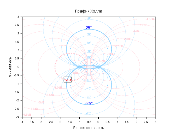 clf h = hallchart(); // 5dB isogain i = find(h.gainLabels.text=="5dB"); // Customizing the label set(h.gainLabels(i),"box","on","font_size",2,"font_foreground",color("red")); // Customizing the line h.gainLines(i).thickness = 3; // +/-25° isophases i = grep(h.phaseLabels.text,"25°") // Customizing the labels set(h.phaseLabels(i),"font_size",3,"font_foreground",color("blue")); // Customizing the lines set(h.phaseLines(i), "thickness",2,"line_style",1);