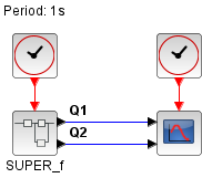 In this example, we create a square wave generator with two inverted outputs by using a SUPER_f block with the contents shown in the following figure, where you can see the use of the CLKINV_f block as event input of the internal square wave generator.
