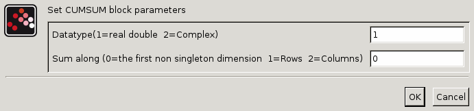 The CUMSUM block cumulatively sums the element of an input MxN matrix U along either the rows, the columns or the first non singleton dimension. The size of the output is also MxN.