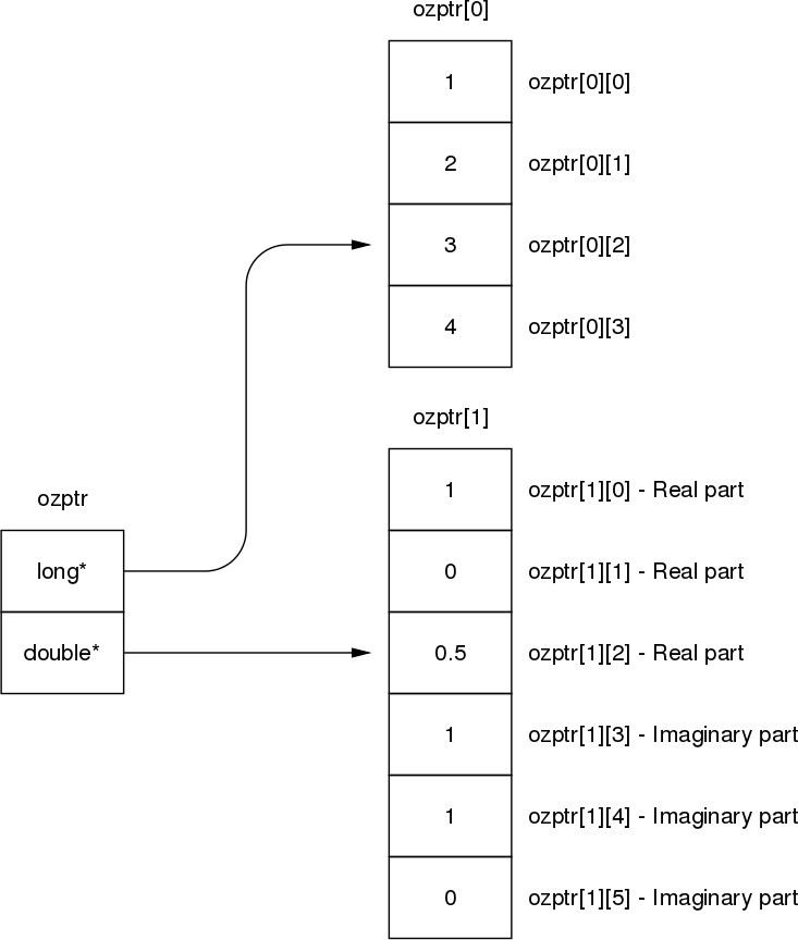 One can also use the set of C macros : GetRealOzPtrs(block,x), GetImagOzPtrs(block,x), Getint8OzPtrs(block,x), Getint16OzPtrs(block,x), Getint32OzPtrs(block,x), Getuint8OzPtrs(block,x), Getuint16OzPtrs(block,x), Getuint32OzPtrs(block,x) to have the appropriate pointer of the data to handle (x is numbered from 1 to noz).