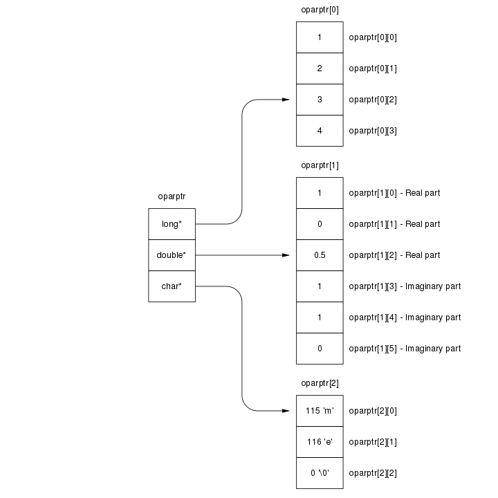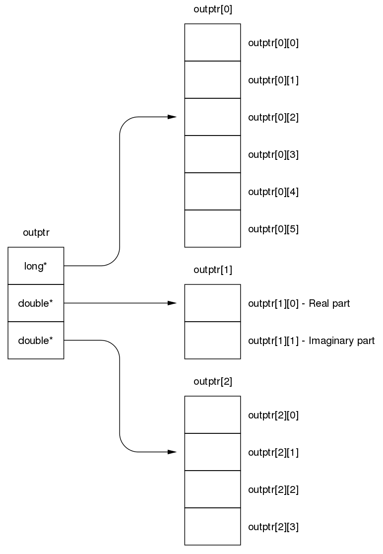 block->outptr contains three pointers, and should be viewed as arrays contained the data for the int32, the real and the complex matrices :