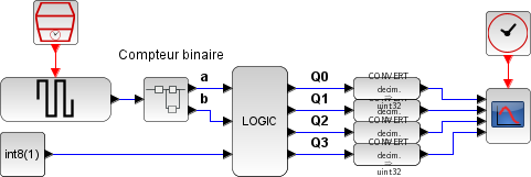 This example shows the use of LOGIC bloc as a demultiplexer. The goal is to send the true constant input on one of the four outputs according to the state of the two selection inputs: a and b. The truth table is the following: