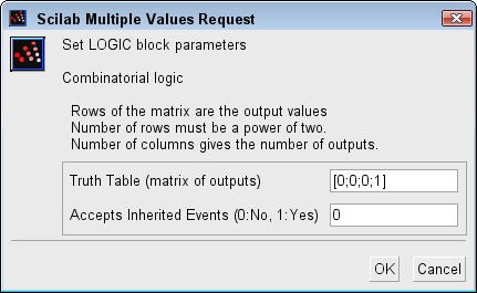 The user must specify a matrix that defines all the possible block outputs in the Truth Table field. In consequence, the number of rows must be a power of two. Each row of the matrix contains a logic combination of input elements.