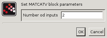 The MATCATV Block outputs the vertical concatenation of multiple matrices. It is also called concatenation according to the rows. The inputs U1,U2,...,Un must have the same number of columns. The user must set the number of input matrices in the Number of input parameter.