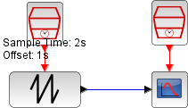 This diagram shows the output of the SAWTOOTH_f block with an event period of 2 seconds and an offset of 1 second on event generation.