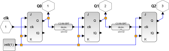 In this example the Super block is a binary counter with 3 bits output. In order to obtain the corresponding decimal value, the outputs Q1 and Q2 of the counter are respectively shifted left of one bit and of two bits. Finally the Q0 output, and the shifted outputs are added.