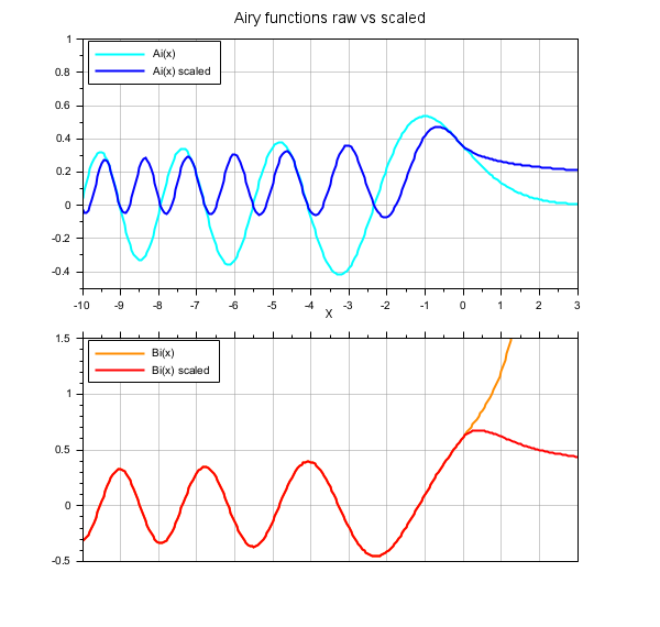 x = -10:0.05:3; clf drawlater subplot(2,1,1) // Ai, Ai scaled plot(x, airy("Ai",x), x, airy("Ai",x, %t), "color", ["blue" "cyan"]) gca().margins(4) = 0.08; gca().data_bounds(3:4) = [-0.5 1]; gca().tight_limits = "on"; xgrid(color("grey60"),1,7) legend(["Ai(x)" "Ai(x) scaled"],"in_upper_left") title("Airy functions raw vs scaled", "fontsize", 3) subplot(2,1,2) // Bi, Bi scaled plot(x, airy("Bi", x), x, airy("Bi",x, %t), "color", ["red" "darkorange"]) legend(["Bi(x)" "Bi(x) scaled"],"in_upper_left") xlabel("x", "fontsize", 3) gca().margins(3) = 0.08; gca().x_location = "top"; gca().x_ticks.labels = emptystr(gca().x_ticks.labels); gca().data_bounds(3:4) = [-0.5 1.5]; gca().tight_limits = "on"; xgrid(color("grey60"),1,7) gcf().children.children.children.thickness = 2; drawnow