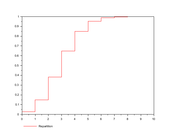 S = 0:1:10; Pr = 0.3 * ones(S); Ompr = 1-Pr; Xn = 10*ones(S); [p,q]=cdfbin('PQ',S,Xn,Pr,Ompr); plot2d2("gnn",[0:10]',p,5,"111","Repartition",[0,0,10,1])