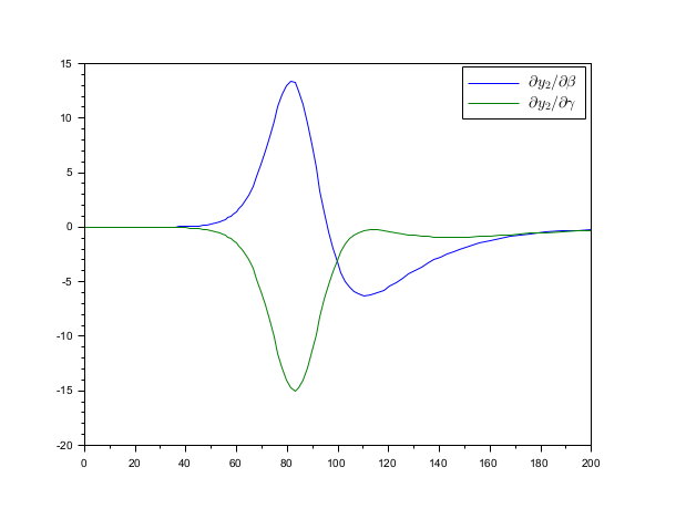 Here we compute the sensitivity of the solution of the SIR epidemiologic system with respect to initial value y2(0), parameters β, γ and plot only the sensitivity of y(2) with respect to β and γ. Option yS0 allows to give the initial value of the sensitivity.