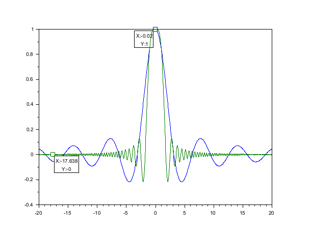 e=plot(x,sinc(x),x,sinc(x.^2));