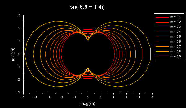 x = linspace(-6,6,300)'; m = 0.1:0.1:0.9; sn = []; for i = 1:length(m) sn(:,i) = ellipj(x+1.4*%i, m(i)); end clf plot2d(imag(sn), real(sn)) title("sn(-6:6 + 1.4i)", "fontsize",4) xlabel("imag(sn)", "fontsize",2); ylabel("real(sn)", "fontsize",2); colordef(gcf(),"none") gca().data_bounds(1:2) = [-5 5]; gca().tight_limits(1) = "on"; isoview legend(gca(), msprintf("m =%4.1f\n",m'),"out_upper_right");