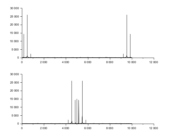 // Make a signal t = 0:0.1:1000; x = 3*sin(t)+8*sin(3*t)+0.5*sin(5*t)+3*rand(t); // Compute the fft y = fft(x,-1); // Display clf(); subplot(2,1,1); plot2d(abs(y)) subplot(2,1,2); plot2d(fftshift(abs(y)))