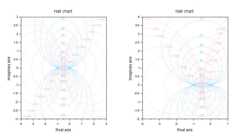clf h = hallchart(); // 5dB isogain i = find(h.gainLabels.text=="5dB"); // Customizing the label set(h.gainLabels(i),"box","on","font_size",2,"font_foreground",color("red")); // Customizing the line h.gainLines(i).thickness = 3; // +/-25° isophases i = grep(h.phaseLabels.text,"25°") // Customizing the labels set(h.phaseLabels(i),"font_size",3,"font_foreground",color("blue")); // Customizing the lines set(h.phaseLines(i), "thickness",2,"line_style",1);