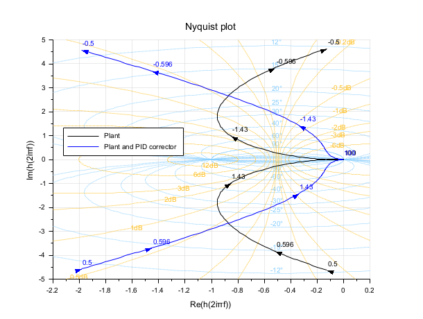 Note that pre-existing titles are kept.s = %s; Plant = syslin('c', 16000/((s+1)*(s+10)*(s+100))); //two degree of freedom PID [tau, xsi] = (0.2, 1.2); PID = syslin('c',(1/(2*xsi*tau*s))*(1+2*xsi*tau*s+tau^2*s^2)); clf nyquist([Plant;Plant*PID], 0.5, 100, ["Plant";"Plant and PID corrector"]); mod = [12 6 3 2 1 0.5 0.2 0.1 -6 -3 -2 -1 -0.5 -0.2 -0.1]; hallchart(mod,, ["goldenrod1" ""]); // Move the caption to avoid hiding data Leg = gca().children(1); set(Leg,"legend_location","by_coordinates","position",[0.15 0.4]);