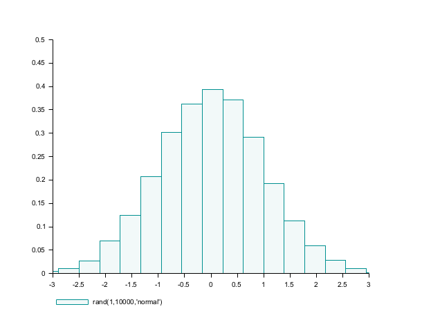 d = rand(1,10000,'normal'); // the gaussian random sample clf(); histplot(20,d); clf(); histplot(20,d,normalization=%f); clf(); histplot(20,d,leg='rand(1,10000,''normal'')',style=5); clf(); histplot(20,d,leg='rand(1,10000,''normal'')',style=16, rect=[-3,0,3,0.5]);