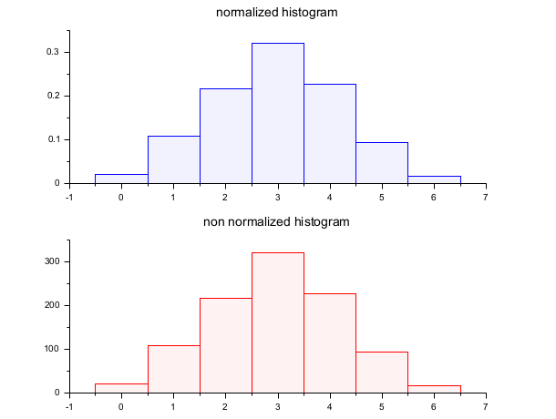d = grand(1000,1,"bin", 6, 0.5); c = linspace(-0.5,6.5,8); clf() subplot(2,1,1) histplot(c, d, style=2); xtitle("Normalized histogram") subplot(2,1,2) histplot(c, d, normalization=%f, style=5); xtitle("Non normalized histogram")