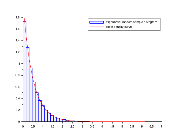 lambda = 2; X = grand(100000,1,"exp", 1/lambda); Xmax = max(X); clf() histplot(40, X, style=2); x = linspace(0,max(Xmax),100)'; plot2d(x,lambda*exp(-lambda*x),strf="000",style=5) legend(["exponential random sample histogram" "exact density curve"]);
