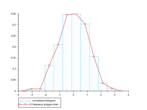 n = 10; data = rand(1,1000,"normal"); clf(); histplot(n, data, style=12, polygon=%t); legend(["normalized histogram" "frequency polygon chart"],"lower_caption");