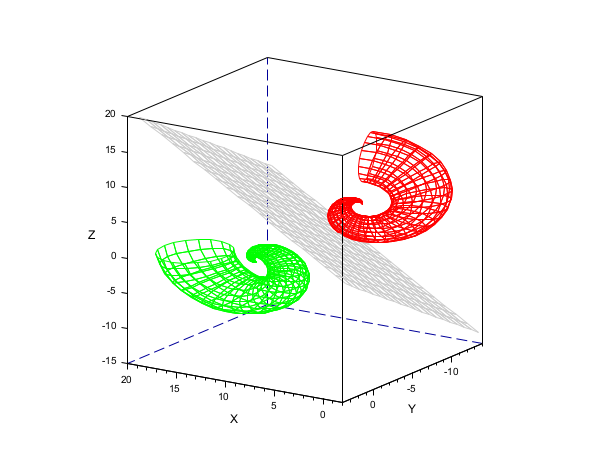 // (OA) = [0 0 1] is reflected in O into (OB) = [ 1 1 0.3 ]: [n, H] = householder([0 0 1]', [ 1 1 0.3 ]'); // "n" is the unit vector orthogonal to the reflecting plane // Emitting object (feature from shell demo): u = linspace(0,2*%pi,40); v = linspace(0,2*%pi,20); Xe = (cos(u).*u)'*(1+cos(v)/2)+10; Ye = (u/2)'*sin(v); Ze = (sin(u).*u)'*(1+cos(v)/2); // Symetrical object: Pe = [ Xe(:)' ; Ye(:)' ; Ze(:)']; Pr = H*Pe; Xr = matrix(Pr(1,:),40,-1); Yr = matrix(Pr(2,:),40,-1); Zr = matrix(Pr(3,:),40,-1); // Reflecting plane containing O: n(1).x + n(2).y + n(3).z = 0 // Sampling space: x = linspace(min([Xe(:);Xr(:)]), max([Xe(:);Xr(:)]),20); y = linspace(min([Ye(:);Yr(:)]), max([Ye(:);Yr(:)]),20); [X, Y] = meshgrid(x,y); // Generating the mirror: deff("z = mirror(x,y,n)","z = -n(1)/n(3)*x - n(2)/n(3)*y") Zm = mirror(X,Y,n); // Plotting: clf() isoview() drawlater() f = gcf(); f.color_map = [ 0.8 0.8 0.8 ; jet(100)]; surf(Xe,Ye,Ze) surf(X,Y,Zm) surf(Xr,Yr,Zr) a = gca(); a.rotation_angles = [74 123]; a.children.color_flag = 0; a.children.color_mode = 0; a.children(1).foreground = color("red"); a.children(2).foreground = 1; a.children(3).foreground = color("green"); drawnow()