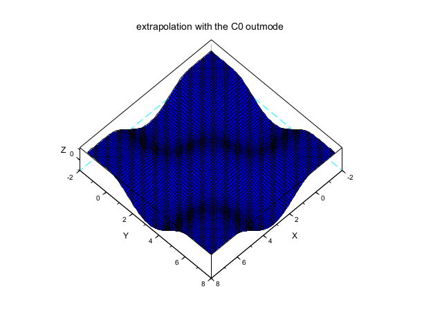 n = 7; // a n x n interpolation grid x = linspace(0,2*%pi,n); y = x; z = cos(x')*cos(y); C = splin2d(x, y, z, "periodic"); // now evaluate on a bigger domain than [0,2pi]x [0,2pi] m = 80; // discretization parameter of the evaluation grid xx = linspace(-0.5*%pi,2.5*%pi,m); yy = xx; [XX,YY] = ndgrid(xx,yy); zz1 = interp2d(XX,YY, x, y, C, "C0"); plot3d(xx, yy, zz1, flag=[2 6 4]) xtitle("extrapolation with the C0 outmode")