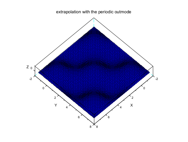 n = 7; // a n x n interpolation grid x = linspace(0,2*%pi,n); y = x; z = cos(x')*cos(y); C = splin2d(x, y, z, "periodic"); // now evaluate on a bigger domain than [0,2pi]x [0,2pi] m = 80; // discretization parameter of the evaluation grid xx = linspace(-0.5*%pi,2.5*%pi,m); yy = xx; [XX,YY] = ndgrid(xx,yy); zz3 = interp2d(XX,YY, x, y, C, "periodic"); plot3d(xx, yy, zz3, flag=[2 6 4]) xtitle("extrapolation with the periodic outmode")