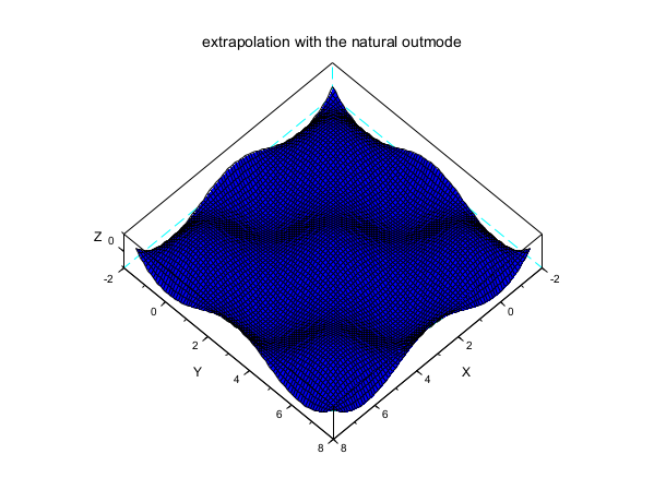 n = 7; // a n x n interpolation grid x = linspace(0,2*%pi,n); y = x; z = cos(x')*cos(y); C = splin2d(x, y, z, "periodic"); // now evaluate on a bigger domain than [0,2pi]x [0,2pi] m = 80; // discretization parameter of the evaluation grid xx = linspace(-0.5*%pi,2.5*%pi,m); yy = xx; [XX,YY] = ndgrid(xx,yy); zz4 = interp2d(XX,YY, x, y, C, "natural"); plot3d(xx, yy, zz4, flag=[2 6 4]) xtitle("extrapolation with the natural outmode")