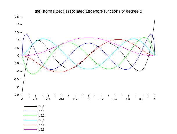 // example 2 : plot of the associated Legendre functions of degree 5 l = nearfloat("pred",1); x = linspace(-l,l,200)'; y = legendre(5, 0:5, x, "norm"); clf() plot2d(x,y', leg="p5,0@p5,1@p5,2@p5,3@p5,4@p5,5") xtitle("the (normalized) associated Legendre functions of degree 5")