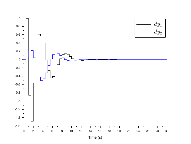 // Form the state space model M = 1; m = 0.2; k = 0.1; b = 0.004; A = [0 1 0 0 -k/M -b/M k/M b/M 0 0 0 1 k/m b/m -k/m -b/m]; B = [0; 1/M; 0; 0]; C = [1 0 0 0 //dy1 0 0 1 0];//dy2 //inputs u and e; outputs dy1 and dy2 P = syslin("c",A, B, C); // Discretize it dt=0.5; Pd=dscr(P, dt); // The noise variances Q_e=1; //additive input noise variance R_vv=0.0001*eye(2,2); //measurement noise variance Q_ww=Pd.B*Q_e*Pd.B'; //input noise adds to regular input u Qwv=blockdiag(Q_ww,R_vv); //The compensator weights Q_xx=diag([0.1 0 5 0]); //Weights on states R_uu = 0.3; //Weight on input Qxu=blockdiag(Q_xx,R_uu); //----syntax [K,X]=lqg(P,Qxu,Qwv)--- J=lqg(Pd,Qxu,Qwv); //----syntax [K,X]=lqg(P_aug,r)--- // Form standard LQG model [Paug,r]=lqg2stan(Pd,Qxu,Qwv); // Form standard LQG model J1=lqg(Paug,r); // Form the closed loop Sys=Pd/.(-J); // Compare real and Estimated states for initial state evolution t = 0:dt:30; // Simulate system evolution for initial state [1;0;0;0; y = flts(zeros(t),Sys,eye(8,1)); clf; plot2d(t',y') e=gce();e.children.polyline_style=2; L=legend(["$dy_1$","$dy_2$"]);L.font_size=4; xlabel('Time (s)')