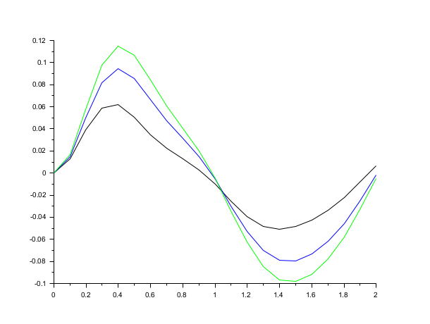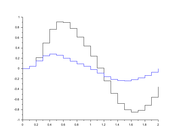 //Linear system with switching input deff('xdu = phis(t,x,u,flag)', 'if flag==0 then xdu=A*x+B*u; else xdu=1-u; end'); x0 = [1;1]; A = [-1,2;-2,-1]; B = [1;2]; u = 0; nu = 1; stdel = [1,0]; u0 = 0; t = 0:0.05:10; xu = odedc([x0;u0], nu, stdel, 0, t, phis); x = xu(1:2,:); u = xu(3,:); nx = 2; plot2d(t, x', [1:nx], '161') plot2d2('onn', t', u', [nx+1:nx+nu], '000'); //Fortran external (see fydot2.f): norm(xu - odedc([x0;u0], nu, stdel, 0, t, 'phis'), 1)