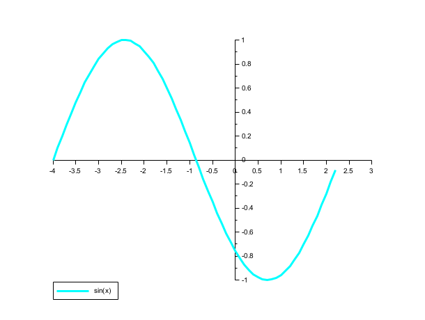 // axis centered at (0,0) clf(); x = [0:0.1:2*%pi]'; poly1 = plot2d(x-4,sin(x),1,leg="sin(x)"); a = gca(); // Handle on axes entity a.x_location = "origin"; a.y_location = "origin"; // Some operations on entities created by plot2d ... isoview() a = gca(); poly1.foreground = 4; // another way to change the style... poly1.thickness = 3; // ...and the thickness of a curve. poly1.clip_state='off'; // clipping control // find the legend leg = findobj(gca(),"type","Legend"); leg.font_style = 9; leg.line_mode = "on"; isoview("off")