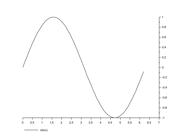 // axis on the right clf(); x=[0:0.1:2*%pi]'; plot2d(x,sin(x),leg="sin(x)"); a=gca(); // Handle on axes entity a.y_location ="right";