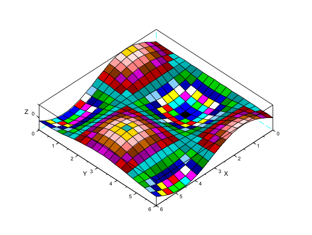 // same plot using facets computed by genfac3d t=[0:0.3:2*%pi]'; z=sin(t)*cos(t'); [xx,yy,zz]=genfac3d(t,t,z); plot3d1(xx,yy,zz)