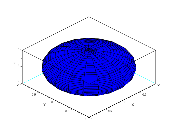 // plot of a sphere using facets computed by eval3dp deff("[x,y,z]=sph(alp,tet)",["x=r*cos(alp).*cos(tet)+orig(1)*ones(tet)";.. "y=r*cos(alp).*sin(tet)+orig(2)*ones(tet)";.. "z=r*sin(alp)+orig(3)*ones(tet)"]); r=1; orig=[0 0 0]; [xx,yy,zz]=eval3dp(sph,linspace(-%pi/2,%pi/2,40),linspace(0,%pi*2,20)); e=plot3d(xx,yy,zz) e.color_flag=1; scf(2); plot3d1(xx,yy,zz) // the 2 graphics are similar