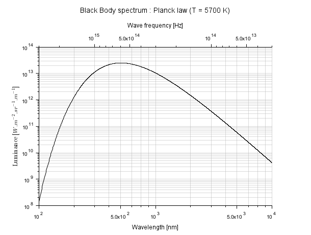 title("Black Body spectrum : Planck law (T = 5700 K)", "fontsize",3)
