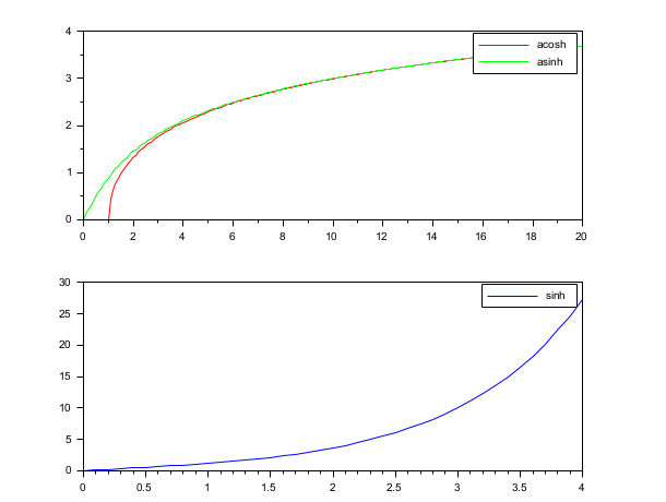 clf() a1=newaxes(); a1.axes_bounds=[0,0,1.0,0.5]; t=0:0.1:20; plot(t,acosh(t),'r') a2=newaxes(); a2.axes_bounds=[0,0.5,1.0,0.5]; x=0:0.1:4; plot(x,sinh(x)) sca(a1); //make first axes current plot(t,asinh(t),'g') legend(['acosh','asinh']) sca(a2); //make second axes current legend('sinh')