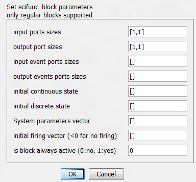 This block can realize any type of Scicos block. The function of the block is defined interactively using dialogue boxes and in Scilab language. During simulation, these instructions are interpreted by Scilab; the simulation of diagrams that include these types of blocks is slower. For more information see Scicos reference manual.