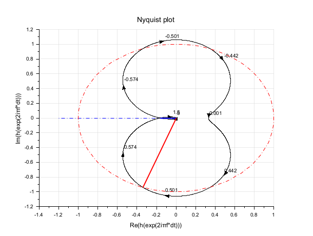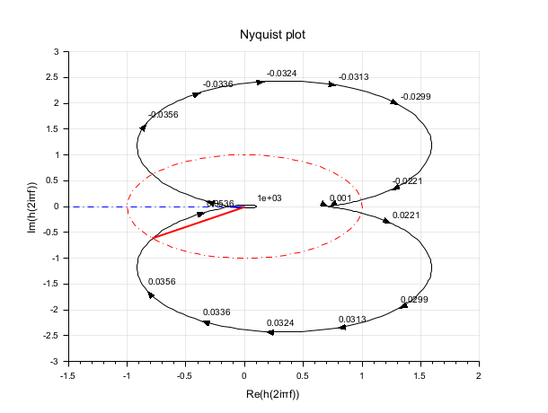 //continuous case h=syslin('c',0.02909+0.11827*%s+0.12823*%s^2+0.35659*%s^3+0.256*%s^4+0.1*%s^5,.. 0.0409+0.1827*%s+1.28225*%s^2+3.1909*%s^3+2.56*%s^4+%s^5); show_margins(h) show_margins(h,'nyquist')